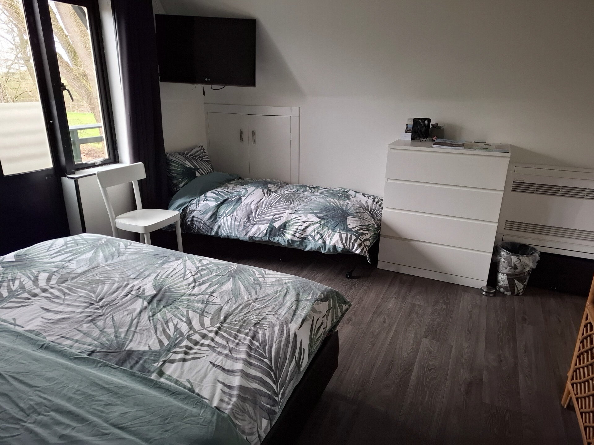 Mooie ruime slaapkamer met honderden meters uitzicht over de weilanden. Weinig verkeer, heerlijk rustig op de vogelgeluiden en wind in de bomen na ;-).